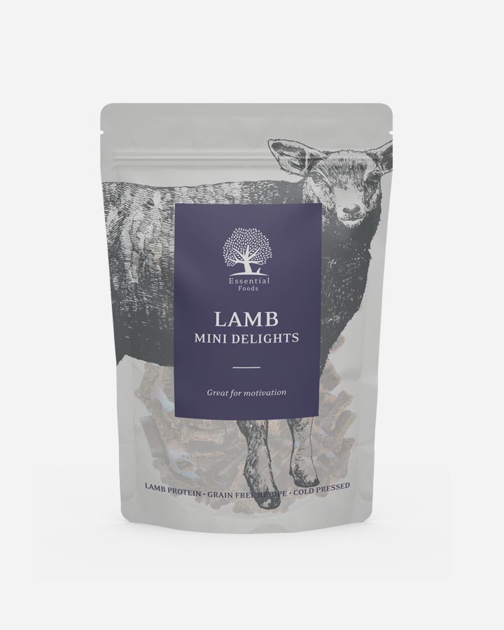 Discover ESSENTIAL FOODS grain-free, cold-pressed dog treats with 70% protein, including a minimum of 50% lamb.